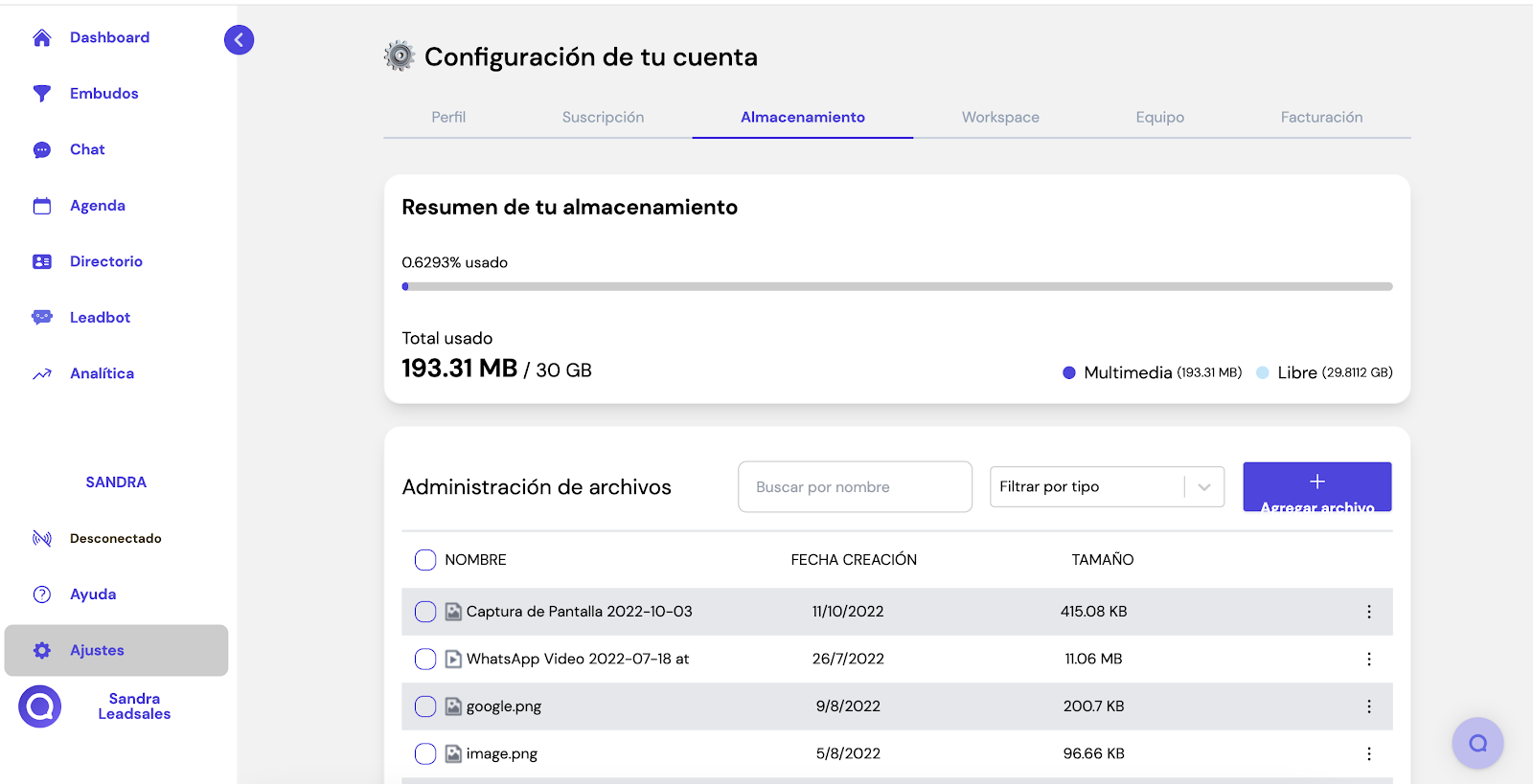 En AJUSTES > ALMACENAMIENTO podrás administrar los archivos que también desees subir a Leadsales y al mismo tiempo, podrás visualizar el espacio que queda disponible en tu cuenta.