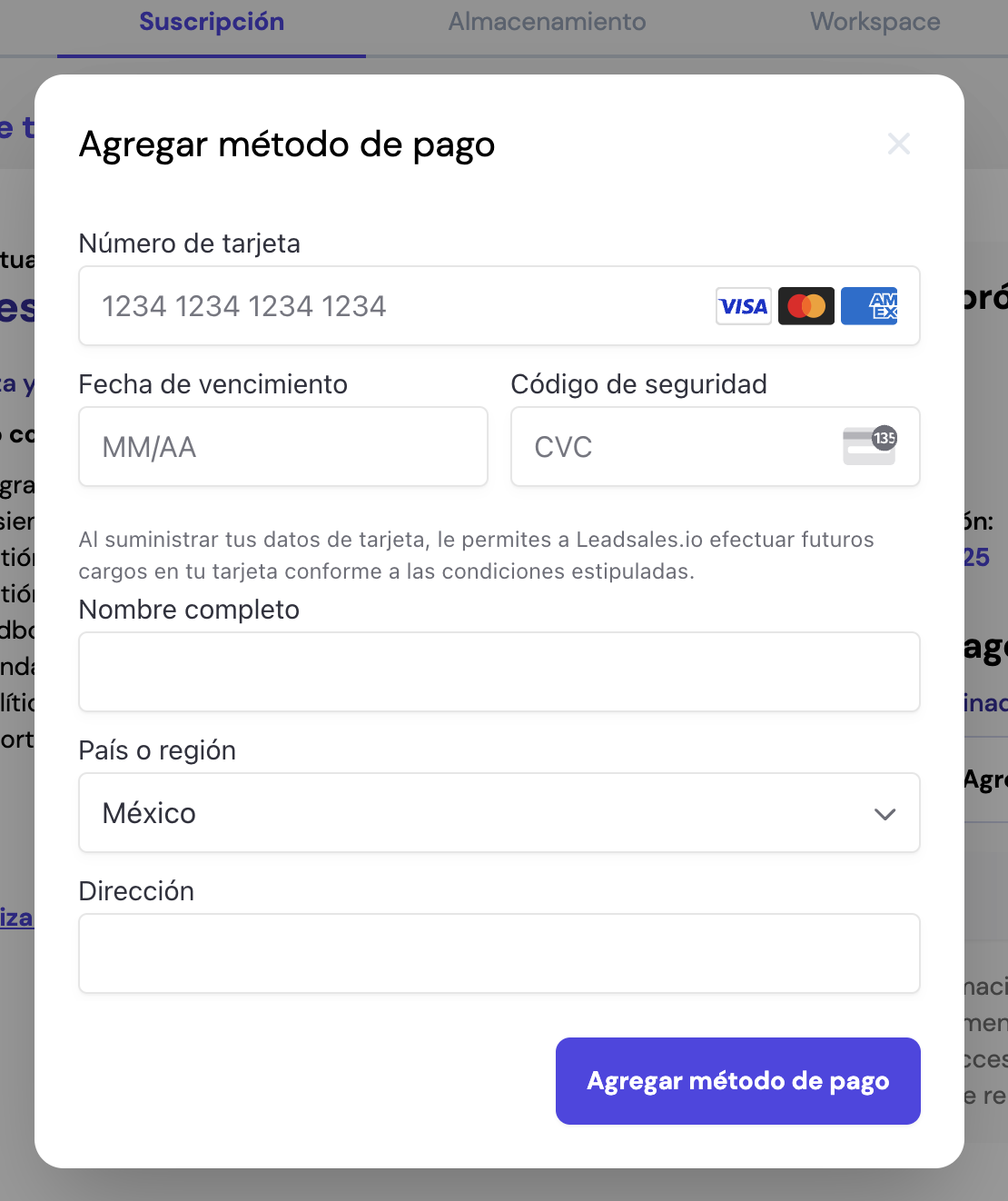 3. Ahora completa la información solicitada y da clic en "Agregar método de pago"
