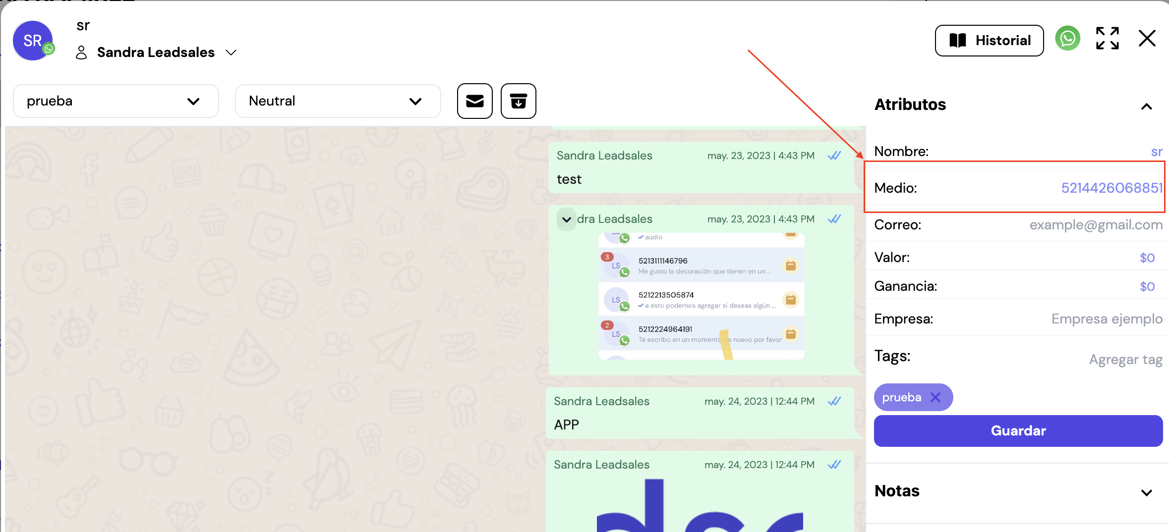 El medio (número de teléfono) no se puede editar, solo podrás editar el nombre y completar el resto de campos, como lo son: correo, valor, ganancia, empresa y agregar tags.